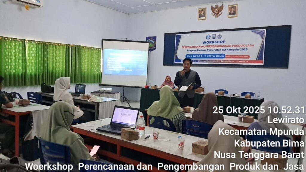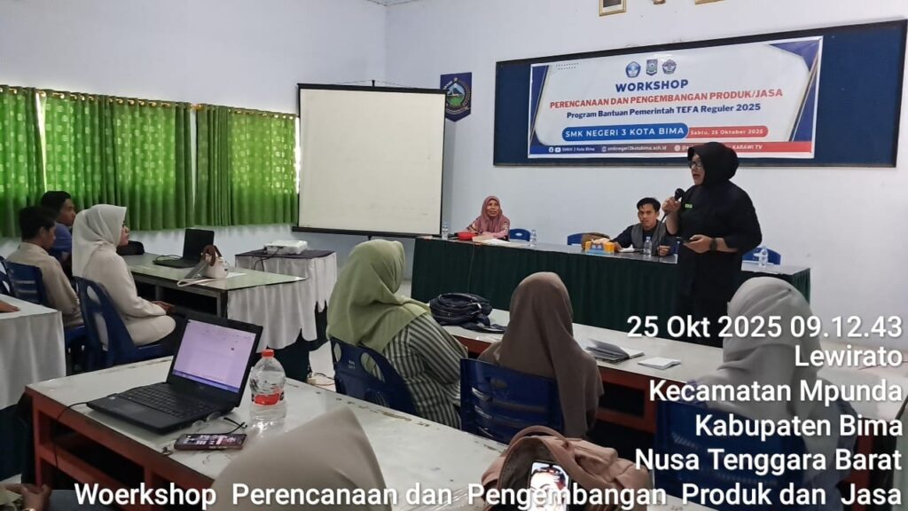 Kota Bima, – Dalam upaya mewujudkan visi SMK yang adaptif, unggul, dan berdaya saing global, SMKN 3 Kota Bima sukses menggelar Workshop Perencanaan dan Pengembangan Produk/Jasa Program Bantuan Pemerintah Teaching Factory (TEFA) Reguler 2025. Kegiatan yang krusial ini dilaksanakan pada Sabtu, 25 Oktober 2025, bertempat di Ruang Sidang SMKN 3 Kota Bima.