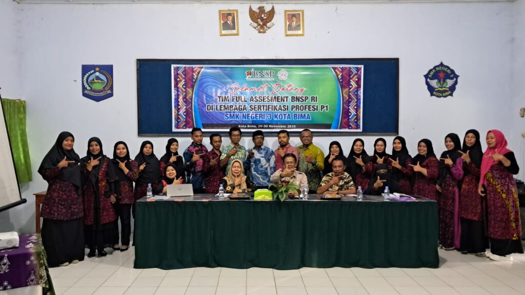Kota Bima, NTB – Sekolah Menengah Kejuruan Negeri (SMKN) 3 Kota Bima kembali menunjukkan komitmennya dalam peningkatan mutu pendidikan kejuruan. Pada hari Sabtu, 29 November 2025, SMKN 3 Kota Bima menerima kunjungan Visitasi dari Tim Badan Nasional Sertifikasi Profesi Republik Indonesia (BNSP RI) dalam rangka proses pengajuan Lisensi Lembaga Sertifikasi Profesi Pihak Pertama (LSP-P1). Kegiatan penting ini dilaksanakan di Ruang Sidang sebagai tempat acara pembukaan dan Sekretariat/Kantor LSP P1 SMKN 3 Kota Bima tempat verifikasi dokumen.