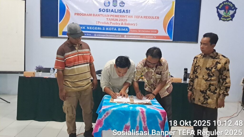 SMKN 3 Kota Bima menggelar Sosialisasi Bantuan Pemerintah TEFA Reguler 2025 pada Sabtu, 18 Oktober 2025 di Ruang Sidang sekolah. Kegiatan ini menjadi langkah strategis dalam memperkuat sinergi antara dunia pendidikan vokasi dan industri, khususnya dalam bidang kuliner. Panitia membuka acara dengan menyanyikan lagu Indonesia Raya secara khidmat. Setelah itu, Kepala SMKN 3 Kota Bima, Bapak Jainuddin, S.Pd., MM., menyampaikan sambutan. Beliau menekankan pentingnya kolaborasi antara sekolah dan mitra industri untuk mendukung implementasi TEFA sebagai model pembelajaran berbasis produksi dan jasa. Hadir sebagai narasumber utama, Plt. Kepala Cabang Dinas Pendidikan dan Kebudayaan Bima dan Kota Bima yaitu  Bapak Saidin, S.Pd., S.H., M.Pd., yang memberikan arahan mengenai kebijakan dan tujuan program TEFA Reguler 2025. Narasumber kedua, Bapak Sang Fajar selaku Owner AW Bakery, turut menyampaikan komitmen industri dalam mendukung pelaksanaan TEFA di SMKN 3 Kota Bima. SMKN 3 Kota Bima dan AW Bakery menandatangani Memorandum of Understanding (MoU) sebagai bentuk nyata kerja sama. Kemitraan ini membuka jalan bagi pengembangan Teaching Factory kuliner. Program ini bertujuan memberi pengalaman kerja langsung kepada siswa dan meningkatkan kualitas lulusan agar siap bersaing di dunia industri. Komite Sekolah dan seluruh guru SMKN 3 Kota Bima menghadiri kegiatan sosialisasi dengan antusias. Mereka memberikan dukungan penuh terhadap pelaksanaan TEFA Reguler 2025.Dengan adanya kegiatan ini, SMKN 3 Kota Bima semakin memperkuat posisinya sebagai sekolah vokasi yang adaptif, inovatif, dan berorientasi pada kebutuhan dunia kerja.
