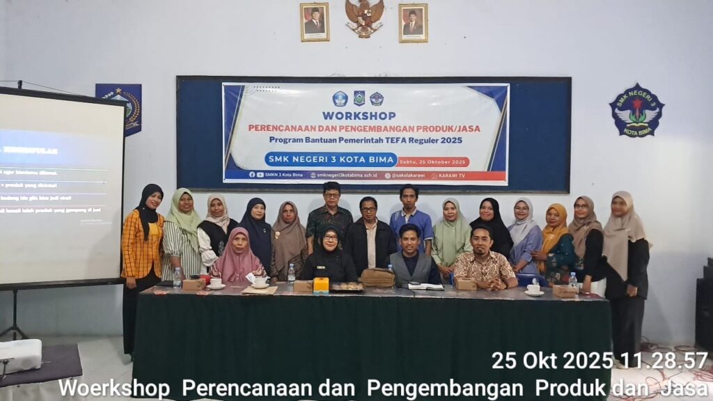 Kota Bima, – Dalam upaya mewujudkan visi SMK yang adaptif, unggul, dan berdaya saing global, SMKN 3 Kota Bima sukses menggelar Workshop Perencanaan dan Pengembangan Produk/Jasa Program Bantuan Pemerintah Teaching Factory (TEFA) Reguler 2025. Kegiatan yang krusial ini dilaksanakan pada Sabtu, 25 Oktober 2025, bertempat di Ruang Sidang SMKN 3 Kota Bima. Workshop ini merupakan bagian integral dari implementasi Program Bantuan Pemerintah TEFA Reguler 2025 yang bertujuan untuk meningkatkan kualitas pembelajaran berbasis produksi dan jasa di lingkungan Sekolah Menengah Kejuruan. Workshop ini dihadiri oleh para Guru Bidang Keahlian Pariwisata serta Kepala Program Keahlian dari setiap program keahlian di SMKN 3 Kota Bima. Mereka didorong untuk merumuskan rencana bisnis yang matang dan berkelanjutan dalam rangka pengembangan Teaching Factory sekolah. Acara diawali dengan menyanyikan Lagu Indonesia Raya, dilanjutkan dengan Sambutan dan Pengarahan dari Kepala SMKN 3 Kota Bima. Dalam sambutannya, Kepala Sekolah menekankan pentingnya sinergi antara kurikulum sekolah dengan kebutuhan riil industri untuk menghasilkan lulusan yang siap kerja dan berwirausaha. Dua materi utama yang disajikan dalam workshop ini berfokus pada tahapan awal yang fundamental dalam pengembangan produk jasa: Kehadiran dua narasumber yang merupakan praktisi bisnis lokal yang sukses memberikan nilai tambah yang signifikan, memastikan materi yang disampaikan tidak hanya teoritis tetapi juga aplikatif dan berorientasi pasar. Workshop ini diharapkan menjadi pijakan awal yang kuat bagi tim pengembang TEFA SMKN 3 Kota Bima untuk menyusun proposal rencana bisnis yang detail dan layak, sehingga pemanfaatan dana bantuan dapat maksimal dan unit produksi sekolah dapat beroperasi secara berkelanjutan, menghasilkan produk unggulan, sekaligus menjadi sarana praktik industri bagi peserta didik.